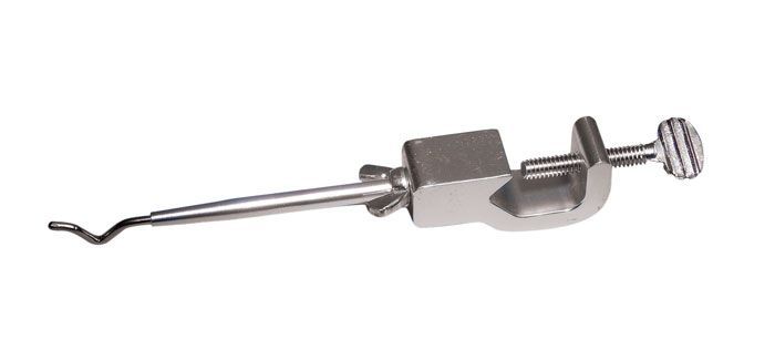 Thermometer clamp features adjustable 360 degree rotating jaw, for attaching up to 1/2" diameter rods and thermometers. Clamp with hook can be rotated and locked in any position. Ideal for supporting suspended thermometers, drying tubes, etc.