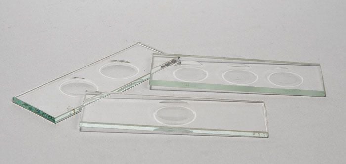 The CSTK Series offers sheet glass concavity slides that are pre-cleaned. They are 3mm thick and are 75mm by 25mm. The spherical concavities are approximately 16mm in diameter and 0.8mm deep. Single, double, or triple concavity options are available.