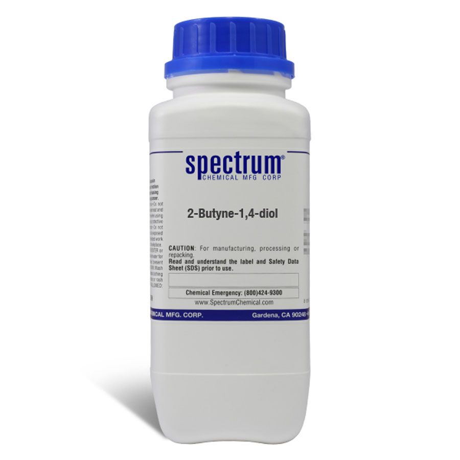 Choose the highest quality solutions and chemicals from Spectrum Chemical. Shop 2-Butyne-1,4-diol is a colorless, hygroscopic solid that is soluble in water and polar organic solvents. It is primarily used as a synthetic organic intermediate used in the manufacture of certain herbicides, textile additives, corrosion inhibitors, plasticizers, synthetic resins, and polyurethanes. It is the major raw material of vitamin B6 and is also used for brightening, preserving, and inhibiting nickel plating.