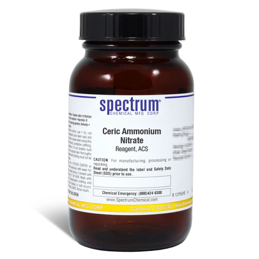 Choose the highest quality solutions and chemicals from Spectrum Chemical. Shop Ceric Ammonium Nitrate, Reagent, ACS is an inorganic compound that is an orange-red, water-soluble cerium salt is widely used as an oxidizing agent in organic synthesis and as a standard oxidant in quantitative analysis. As an ACS grade quality reagent, its chemical specifications are the de facto standards for chemicals used in many high-purity applications and typically designate the highest quality chemical available for laboratory use. Spectrum Chemical manufactured Reagent ACS grade products meet the toughest regulatory standards for quality and purity.