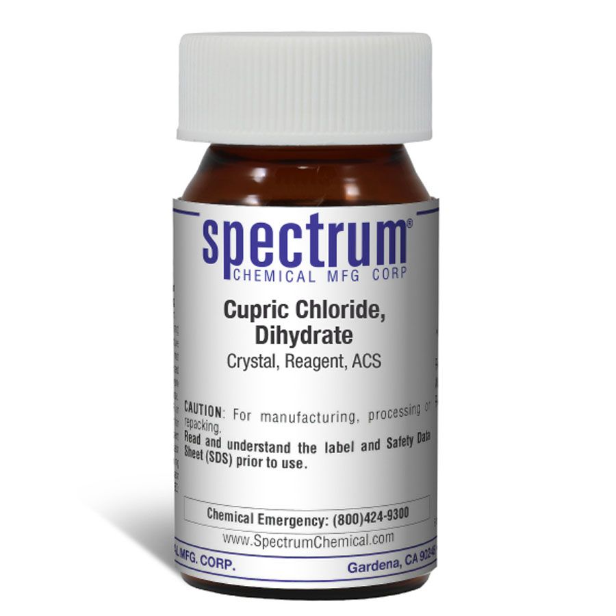 Choose the highest quality solutions and chemicals from Spectrum Chemical. Shop Cupric Chloride, Dihydrate, Crystal, Reagent, ACS is also known as copper chloride. It is a chemical compound with a blue green color. Copper (II) chloride is used as a synthetic catalyst, a pyrotechnic coloring agent and in humidity indicator cards. The Reagent grade denotes that this chemical is the highest quality commercially available and that the American Chemical Society has not officially set any specifications for this material. Spectrum Chemical manufactured Reagent grade products meet the toughest regulatory standards for quality and purity.