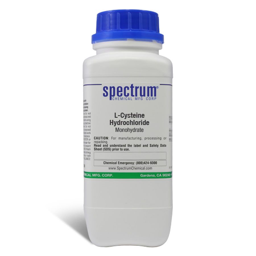 Choose the highest quality solutions and chemicals from Spectrum Chemical. Shop L-Cysteine Hydrochloride, Monohydrate is a semi-essential amino acid and can be biosynthesized in humans. It is often used as a food additive. Ungraded products supplied by Spectrum are indicative of a grade suitable for general industrial use or research purposes and typically are not suitable for human consumption or therapeutic use.