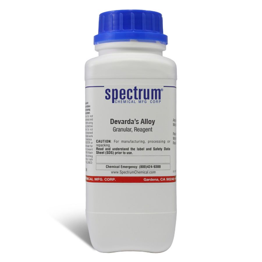 Choose the highest quality solutions and chemicals from Spectrum Chemical. Shop Devarda's Alloy, Granular, Reagent, an alloy of copper, zinc and aluminum, cab be used as reducing agent in analytical chemistry. The Reagent grade denotes that this chemical is the highest quality commercially available and that the American Chemical Society has not officially set any specifications for this material. Spectrum Chemical manufactured Reagent grade products meet the toughest regulatory standards for quality and purity.