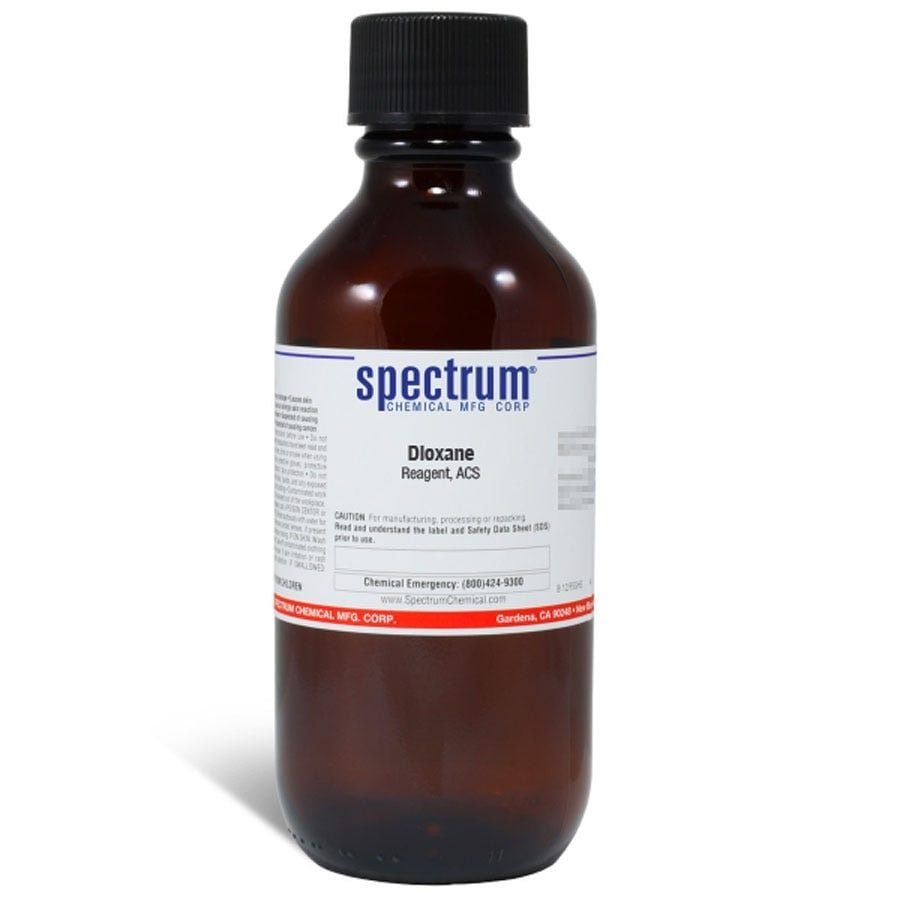 Choose the highest quality solutions and chemicals from Spectrum Chemical. Shop Dioxane, Reagent, ACS is a colorless liquid known as a heterocyclic organic compound. It has a light sweet odor similar to that of diethyl ether and is classified as an ether. Miscible in water and hygroscopic, it is primarily used as a stabilizer for 1,1,1-trichloroethane while in storage or transport in aluminum containers. As an ACS grade Reagent, Spectrum Chemical manufactured Dioxane is used as the quality standard against which other substances are graded and has met the toughest regulatory standards for quality and purity.