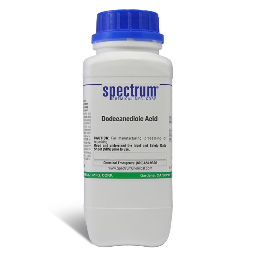 Choose the highest quality solutions and chemicals from Spectrum Chemical. Shop Dodecanedioic Acid, also known as DDDA, is a dicarboxylic acid used as an antiseptic, a corrosion inhibitor, a surfactant, and in painting materials and engineering plastics like nylon 612. Ungraded products supplied by Spectrum are indicative of a grade suitable for general industrial use or research purposes and typically are not suitable for human consumption or therapeutic use.