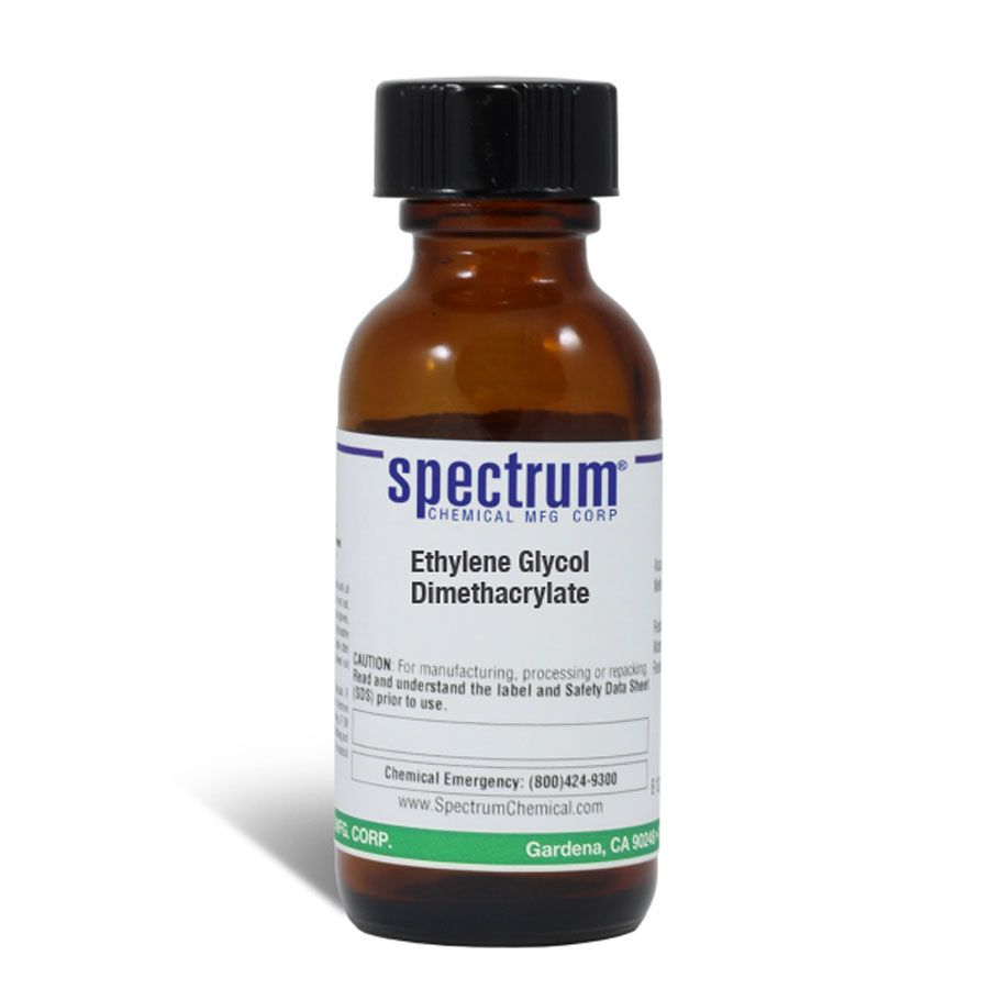 Choose the highest quality solutions and chemicals from Spectrum Chemical. Shop Ethylene Glycol Dimethacrylate is a diester that is formed by the condensation of ethylene glycol and methacrylic acid and used primarily in free radical copolymer crosslinking reactions. Ungraded products supplied by Spectrum are indicative of a grade suitable for general industrial use or research purposes and typically are not suitable for human consumption or therapeutic use.