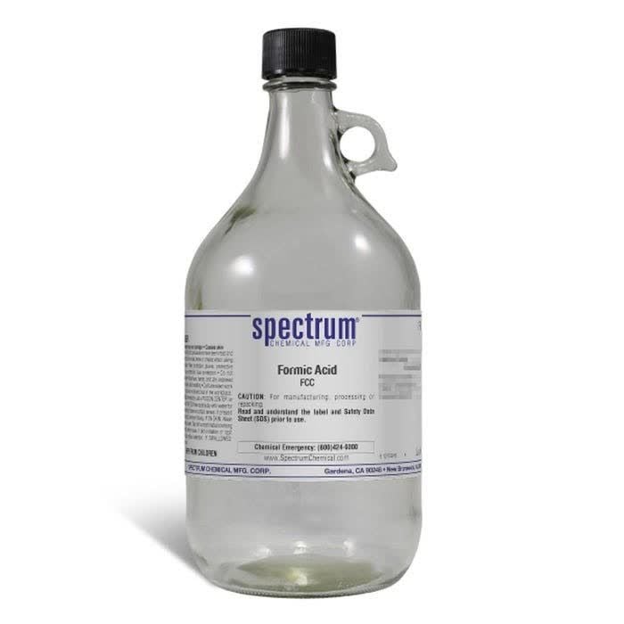 Choose the highest quality solutions and chemicals from Spectrum Chemical. Shop Formic Acid, FCC is the simplest carboxylic acid and one of its biggest uses is as a preservative and antibacterial agent in livestock feed. The FCC grade meets the requirements of the Food Chemical Codex indicates and is suitable for all food, beverage and nutritional supplement applications. Spectrum Chemical offers over 300 Food grade chemical ingredients packaged in laboratory size bottles to production drum quantities and are manufactured, packaged and stored under current Good Manufacturing Practices (cGMP) per 21CFR part 211 in FDA registered and inspected facilities.