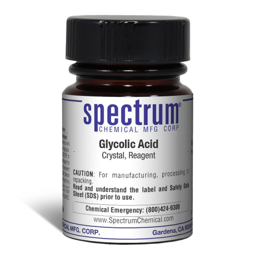 Choose the highest quality solutions and chemicals from Spectrum Chemical. Shop Glycolic Acid, Crystal, Reagent, is slightly stronger than acetic acid. It is often included into emulsion polymers, solvents and additives for ink and paint in order to improve flow properties and impart gloss. It is used in surface treatment products that increase the coefficient of friction on tile flooring. Glycolic acid is a useful synthetic organic intermediate for oxidation-reduction, esterification and long chain polymerizations.