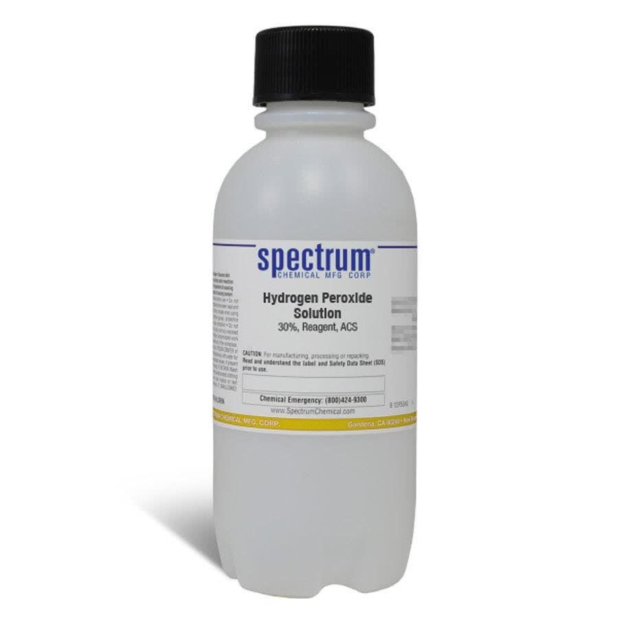 Choose the highest quality solutions and chemicals from Spectrum Chemical. Shop Hydrogen Peroxide Solution, 30 Percent, Reagent, ACS, is the simplest peroxide, a strong oxidizer that appears as a clear and slightly viscous liquid. Its oxidizing properties are so strong that it is considered a highly reactive oxygen species. Due to it being a weak acid it can form hydroperoxide or peroxide salts. One of its biggest uses is in the treatment of drinking water, removing odors, organic materials and the amount of Hydrogen sulfides and Iron. As an ACS grade Reagent, Spectrum Chemical manufactured Hydrogen Peroxide is used as the quality standard against which other substances are graded and has met the toughest regulatory standards for quality and pureness.