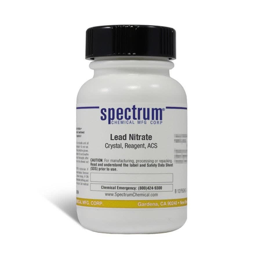 Choose the highest quality solutions and chemicals from Spectrum Chemical. Shop Lead Nitrate, Crystal, Reagent, ACS is an inorganic compound most often occurring as a white powder or colorless crystal. It is soluble in water and is used in gold cyanidation. As an ACS grade quality reagent, its chemical specifications are the de facto standards for chemicals used in many high-purity applications and typically designate the highest quality chemical available for laboratory use. Spectrum Chemical manufactured Reagent ACS grade products meet the toughest regulatory standards for quality and purity.