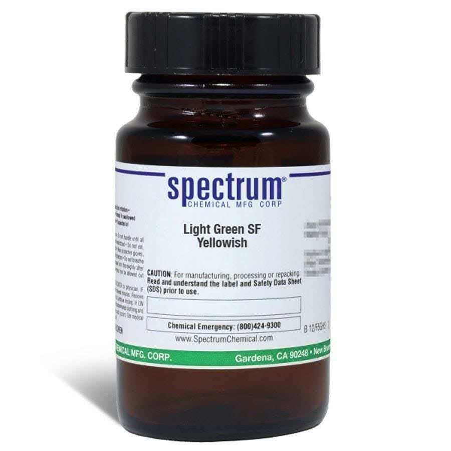 Choose the highest quality solutions and chemicals from Spectrum Chemical. Shop Light Green SF Yellowish is a green triarylmethane dye. It is used in histology for staining collagen. It appears as brownish-red to purple powder and is soluble in cold water.