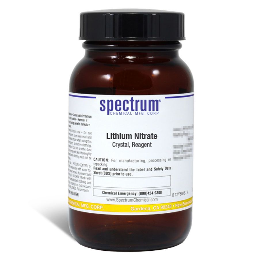 Choose the highest quality solutions and chemicals from Spectrum Chemical. Shop Lithium Nitrate, Crystal, Reagent is the lithium salt of nitric acid and an inorganic compound. Denser than water, its obtained from the reaction of lithium carbonate with nitric acid, it is used for giving fireworks and flares their red color. It is also employed in labs to bind to a trihydrate ion to test bifurcated hydrogen bonds within crystal structures of molecules. An effective oxidizing agent, it is used in submarines and spacecraft to absorb carbon dioxide. Its reagent grade means this is the highest quality commercially available for this chemical and that the American Chemical Society has not officially set any specifications for this material.