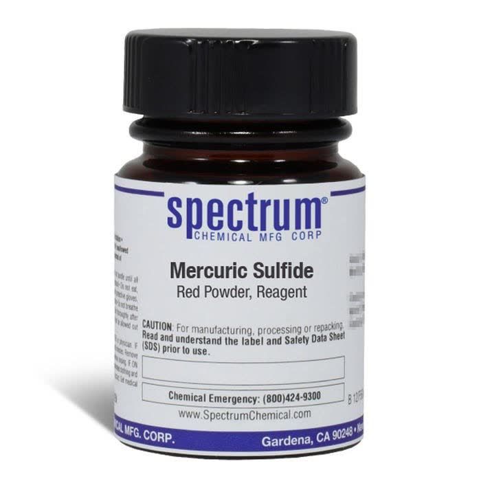 Choose the highest quality solutions and chemicals from Spectrum Chemical. Shop Mercuric Sulfide, Red, Powder, Reagent, also known as Cinnabar or Vermilion, is an inorganic chemical compound insoluble in water and used as a red pigment. The Reagent grade denotes that this chemical is the highest quality commercially available and that the American Chemical Society has not officially set any specifications for this material. Spectrum Chemical manufactured Reagent grade products meet the toughest regulatory standards for quality and purity.