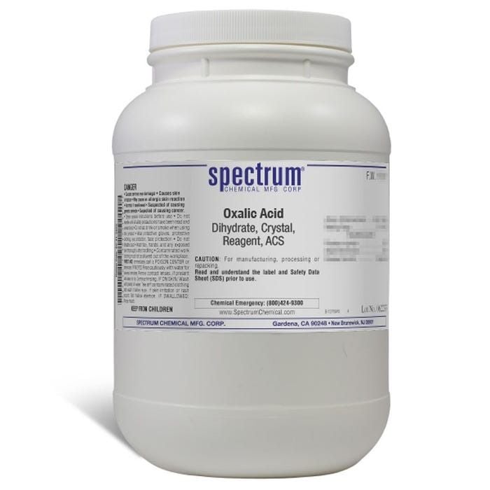 Choose the highest quality solutions and chemicals from Spectrum Chemical. Shop Oxalic Acid, Dihydrate, Crystal, Reagent, ACS is a crystalline solid and organic compound that has no color and dissolves in water. It is categorized as a dicarboxylic acid and is a much stronger acid than acetic acid. As an ACS grade Reagent, Spectrum Chemical manufactured compound is used as the quality standard against which other substances are grade and has met the toughest regulatory standards for quality and pureness.