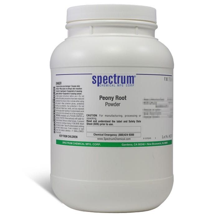 Choose the highest quality solutions and chemicals from Spectrum Chemical. Shop Peony Root, Powder is used by natural medicine enthusiasts for a variety of medicinal indications. Ungraded products supplied by Spectrum are indicative of a grade suitable for general industrial use or research purposes and typically are not suitable for human consumption or therapeutic use.