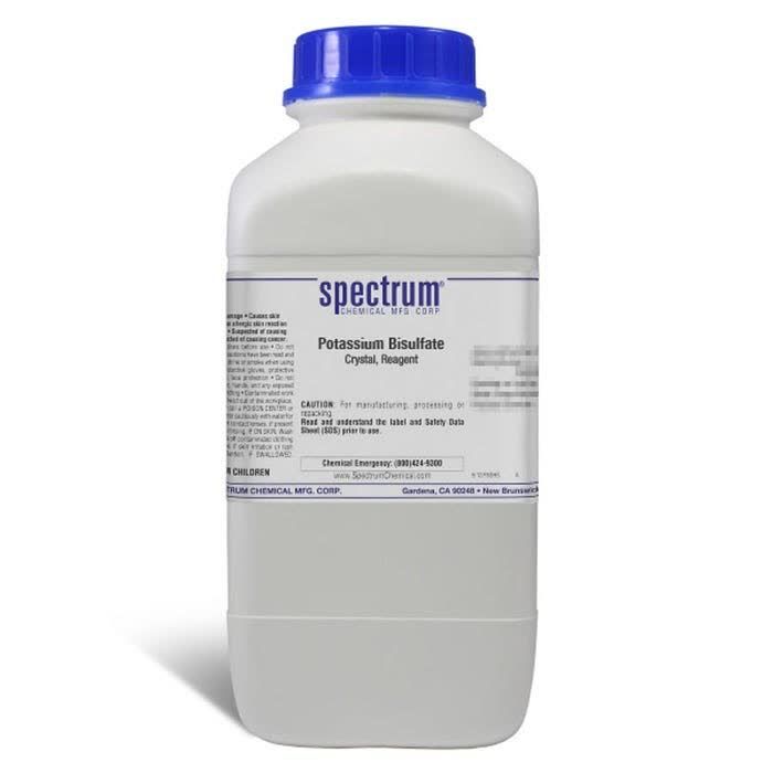 Choose the highest quality solutions and chemicals from Spectrum Chemical. Shop Potassium Bisulfate, Crystal, Reagent, also known as Potassium acid sulfate, is a potassium acid salt of sulfuric acid used as a disintegrating agent in analytical chemistry. The Reagent grade denotes that this chemical is the highest quality commercially available and that the American Chemical Society has not officially set any specifications for this material. Spectrum Chemical manufactured Reagent grade products meet the toughest regulatory standards for quality and purity.