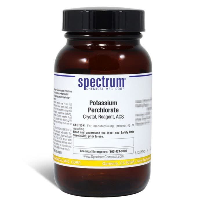 Choose the highest quality solutions and chemicals from Spectrum Chemical. Shop Potassium Perchlorate, Crystal, Reagent, ACS, also known as Perchloric acid or peroidin, is an inorganic salt and used as a strong oxidizer. As an ACS grade quality reagent, its chemical specifications are the de facto standards for chemicals used in many high-purity applications and typically designate the highest quality chemical available for laboratory use. Spectrum Chemical manufactured Reagent ACS grade products meet the toughest regulatory standards for quality and purity.