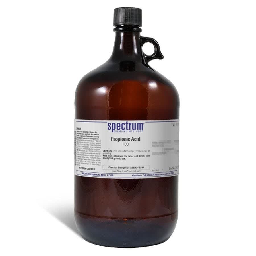 Choose the highest quality solutions and chemicals from Spectrum Chemical. Shop Propionic Acid, FCC is used as a preservative and flavoring agent in packaged foods such as baked goods and cheese. The FCC grade meets the requirements of the Food Chemical Codex indicates and is suitable for all food, beverage and nutritional supplement applications. Spectrum Chemical offers over 300 Food grade chemical ingredients packaged in laboratory size bottles to production drum quantities and are manufactured, packaged and stored under current Good Manufacturing Practices (cGMP) per 21CFR part 211 in FDA registered and inspected facilities.