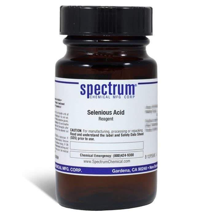 Choose the highest quality solutions and chemicals from Spectrum Chemical. Shop Selenious Acid, Reagent is a chemical compound used in changing the color of steel and nitric acid. The Reagent grade denotes that this chemical is the highest quality commercially available and that the American Chemical Society has not officially set any specifications for this material. Spectrum Chemical manufactured Reagent grade products meet the toughest regulatory standards for quality and purity.