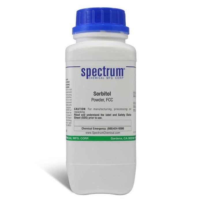 Sorbitol, Powder, FCC is used is as a sugar substitute sweetener in many foods. The FCC grade meets the requirements of the Food Chemical Codex indicates and is suitable for all food, beverage and nutritional supplement applications. Spectrum Chemical offers over 300 Food grade chemical ingredients packaged in laboratory size bottles to production drum quantities and are manufactured, packaged and stored under current Good Manufacturing Practices (cGMP) per 21CFR part 211 in FDA registered and inspected facilities.