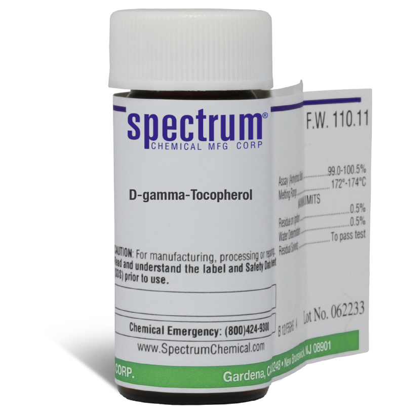 D-gamma-Tocopherol, also known as ?-Tocopherol, is considered to be Vitamin E. Ungraded products supplied by Spectrum are indicative of a grade suitable for general industrial use or research purposes and typically are not suitable for human consumption or therapeutic use.