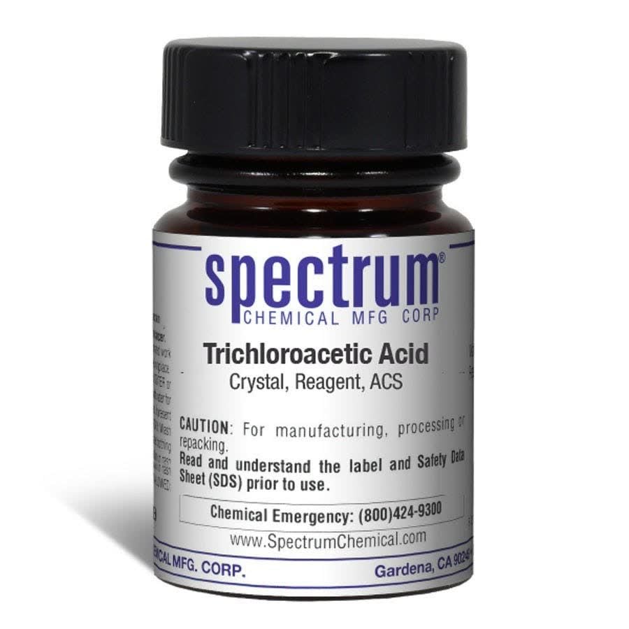 Trichloroacetic Acid, Crystal, Reagent, ACS, also known as TCA, is used in biochemistry to help the precipitation of macromolecules. It is also used in the cosmetic industry as a chemical peel and also as a wart remover. As an ACS grade Reagent, Spectrum Chemical manufactured trichloroacetic acid is used as the quality standard against which other substances are graded and has met the toughest regulatory standards for quality and pureness.