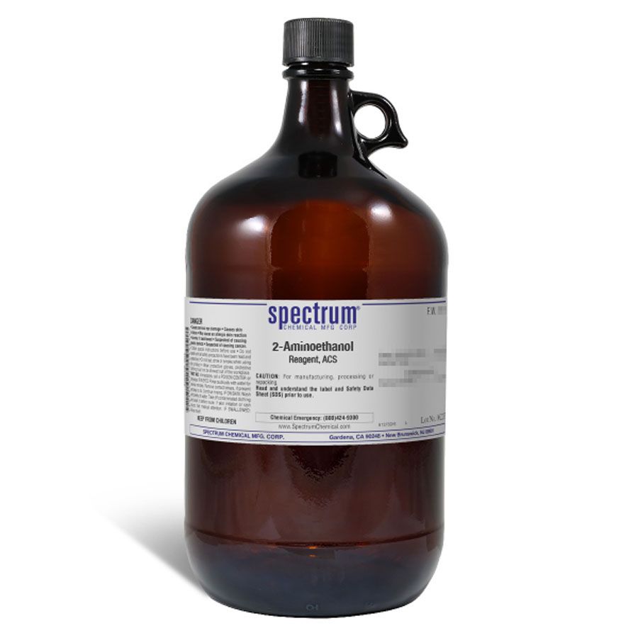 Choose the highest quality solutions and chemicals from Spectrum Chemical. Shop 2-Aminoethanol, Reagent, ACS, also known as Ethanolamine and MEA is a syrup like liquid that is flammable, colorless as well as being corrosive. It is used in detergents, pharmaceuticals, chemical intermediates and corrosion inhibitors as a feed stock. As an ACS grade Reagent, Spectrum Chemical manufactured compounds are used as the quality standard against which other substances are graded and has met the toughest regulatory standards for quality and pureness.