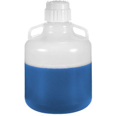 Excellent for storing culture media, distilled water and other solutions. Graduated to contain in 1-gallon and 5-liter increments. Two wide shoulder handles. Cap Size: 83 mm. Accept No. 131/2 rubber stoppers. Leakproof. Autoclavable.