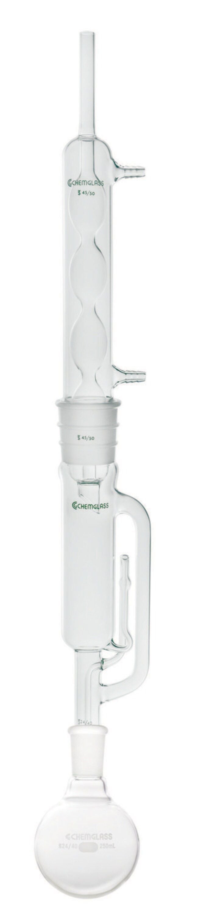 The Chemglass Soxhlet Extraction Apparatus, Complete, Round Bottom Flask is similar to CG-1368, but supplied with a round bottom instead of a flat bottom flask.