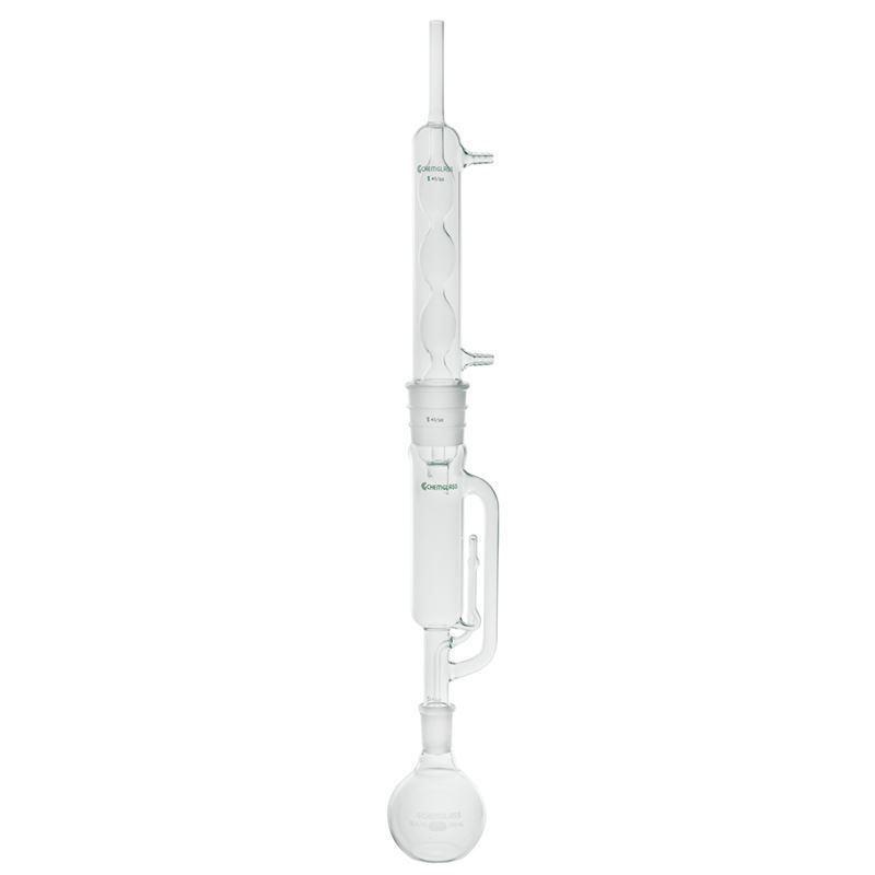This complete Soxhlet extraction apparatus has a flat bottom flask as its receiving container. This unit supports the continuous extraction of solids in conjunction with a suitable solvent. In addition to the flat bottom flask, the full apparatus package also contains an Allihn condenser with an enlarged uptake tube and an extractor that can use glass or paper thimbles. Thimbles and replacement parts are sold separately.