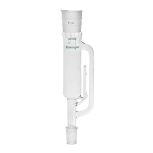 Soxhlet Type Extraction Apparatus is used for continuous extraction of solids with a suitable solvent. This extractor uses Paper or Glass Thimbles. The Condenser has an enlarged uptake tube to improve condensing capacity. The Complete Apparatus consists of an Allihn condenser, extractor, and flat bottom flask. Additional replacement parts are available.