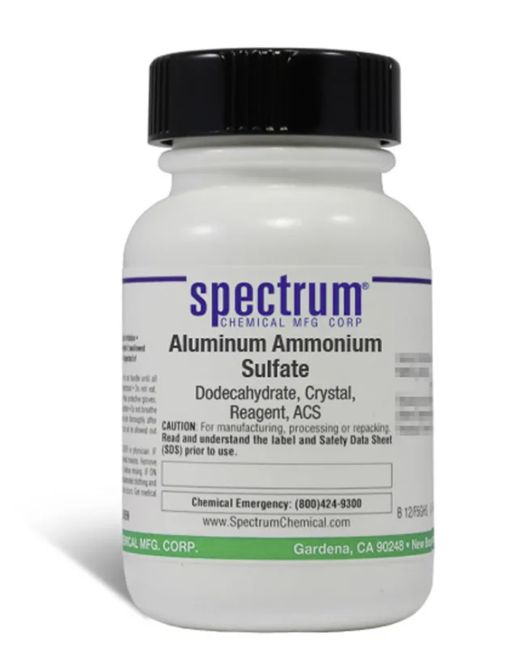 Aluminum Ammonium Sulfate, Dodecahydrate, Crystal, Reagent, ACS, also known as Ammonium alum, has many niche applications, including use in water purification, in porcelain cements, and in some vegetable glues. As an ACS grade quality reagent, its chemical specifications are the de facto standards for chemicals used in many high-purity applications and typically designate the highest quality chemical available for laboratory use. Spectrum Chemical manufactured Reagent ACS grade products meet the toughest regulatory standards for quality and purity.