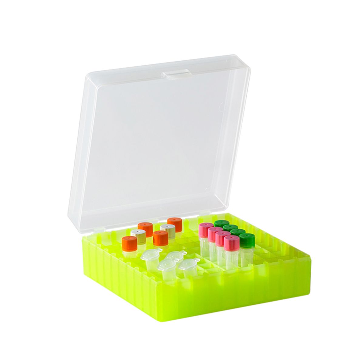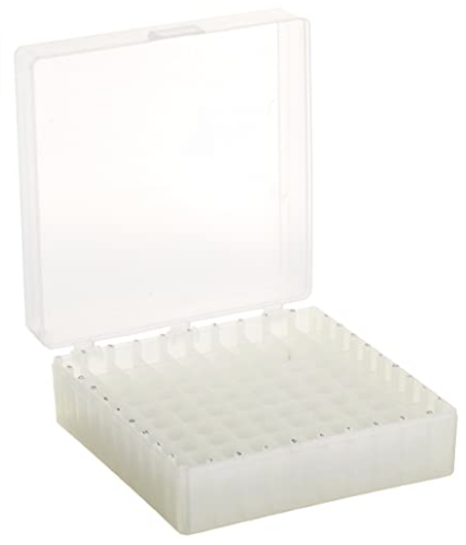 These Labnet 100 Place Polypropylene Microtube Boxes give you easy, convenient storage for your microtube samples: 100 x 1.5/2.0 mL tubes, cryovials or chromatography vials. These sturdy containers can be color-coded, and there is alpha-numeric indexing stamped inside the boxes for further sample organization. With a clear lid, you can observe samples without having to open the lid, and a three-point hinge with a positive catch keeps the lid securely fastened. The boxes can also be frozen (to -80°) as well as autoclaved. Order the solid black version if you are working with light-sensitive materials!