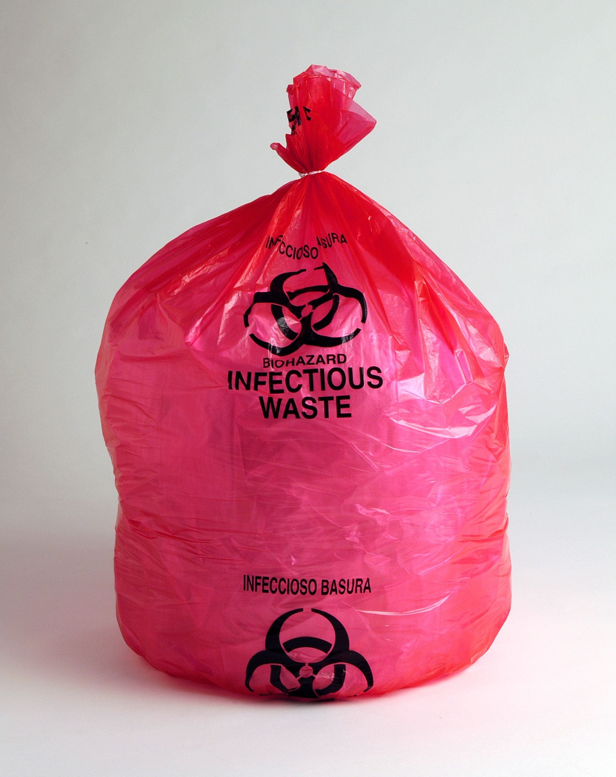 Red colored bags with Biohazard symbol and warnings in English and Spanish printed in black