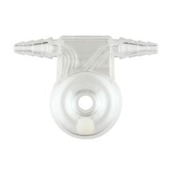 The Chemglass Polystyrene Flow Indicators provides immediate visual of water, air or gas flow. The highly visible white nylon ball rotates in a circular channel during flow. Continuity and relative flow rate are indicated by the ball's rotation. The minimum flow rate to actuate the ball with water is 50mL per minute in the horizontal position, 140mL per minute in the vertical position. With air, the minimum flow rate is 3L/min in the horizontal position, 8L/min in the vertical position. The maximum working pressure is 10 PSI. Hose connections will accept 1/4" to 3/8" ID tubing.