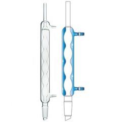 Allihn Condensers from Chemglass offer a plain tubulation at the top. There is a lower inner drip tip joint. The hose connections have a 10 mm outer diameter at the middle serration.