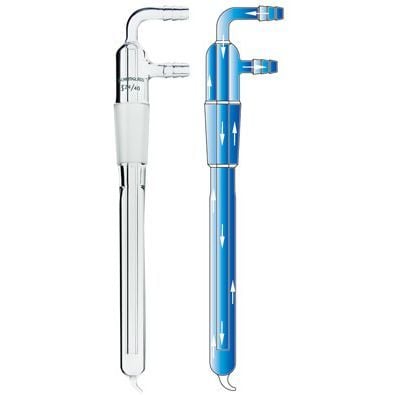 Cold-Finger Condensers from Chemglass offer different size options for inner joints. It has a sealed lower drip tip for drop control. At the middle serration, there is a 10 mm outer diameter hose connection.