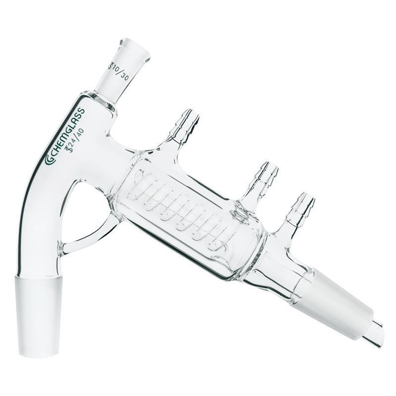 The Improved Short-Path Distilling Heads from Chemglass feature a condenser that is a combination of a cold coil and Liebig. The head is great when distilling medium to high boiling point solvents. It is available with or without Vigreux indentations.
