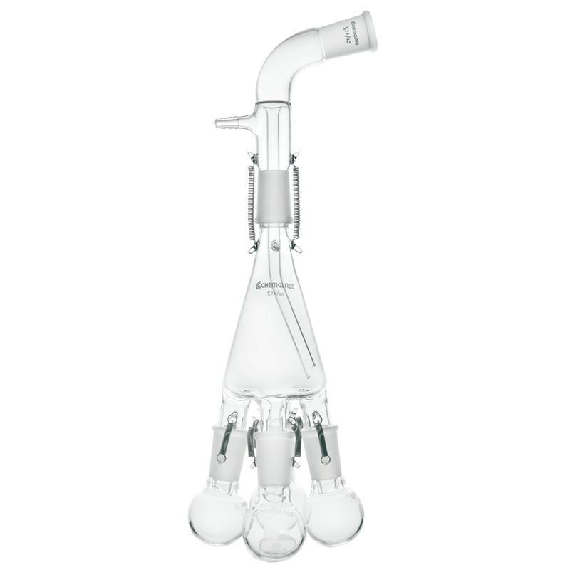 The Distillation Receivers from Chemglass has theupper vacuum adapter bent at a 105° angle. Four flasks can be progressively filled with this distillation receiver. It comes standard with a vacuum adapter, distribution adapter, 4 flasks with hooks and 10 springs.