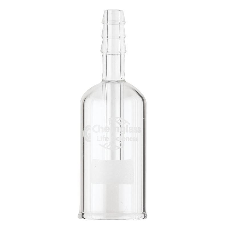 The Aseptic Filling Bells from Chemglass features tubing attached to the serrated hose connection while the receiving vessel is placed inside the bell. It is created with Type 1 Class A borosilicate glass.