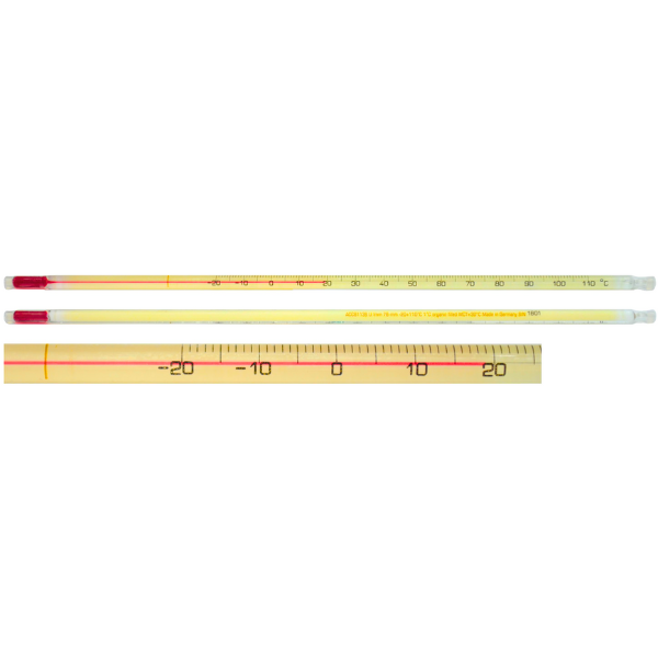 The Thermco Products® Partial Immersion Spirit Thermometers prioritize user health and safety. They are coated in a PTFE safety jacket, offering resistance to spills, acids, and alkalis. Designed for 76 mm partial immersion, these thermometers feature clear vertical numbers in Celsius (°C) or Fahrenheit (°F) scales.