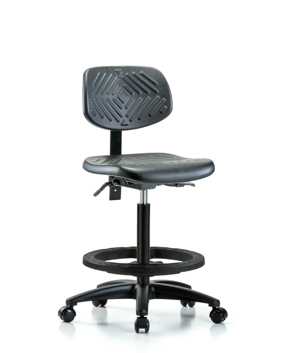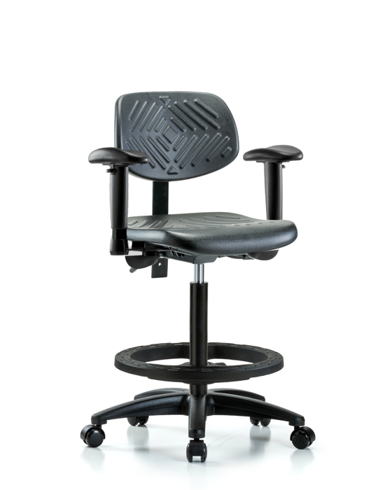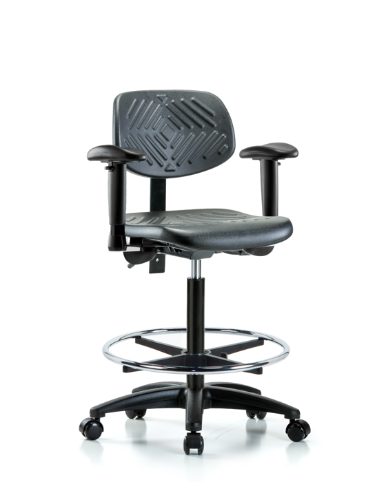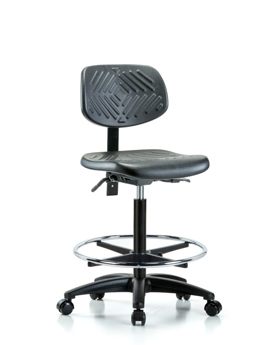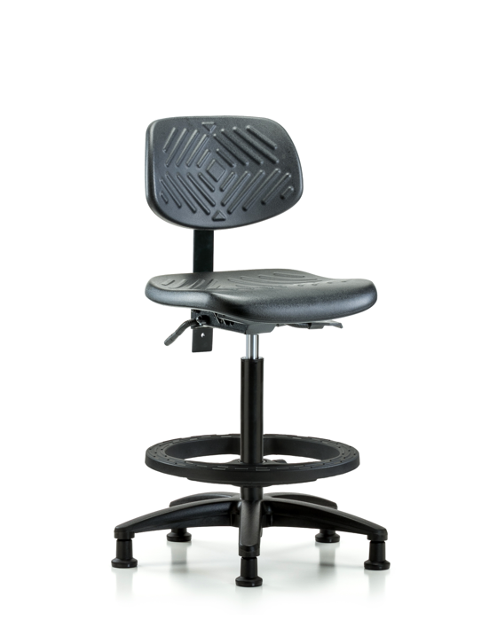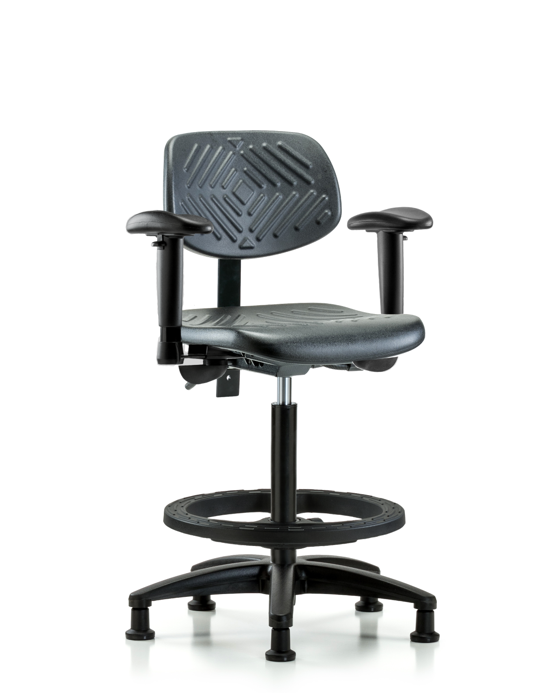Black Polyurethane Nylon Base Chairs, High Bench Height is adjustable from 23.25 - 33.25 inches from the top of the seat to the floor and features ergonomic adjustments including seat height and locking back tilt. Each chair is available with a nylon or chrome adjustable foot ring, locking seat tilt, 6-way adjustable arm rests. The black, nylon-reinforced fiberglass base with stationary, non-marring glides or casters are suitable for hard floors in chemical, soil, and puncture-resistant polyurethane.