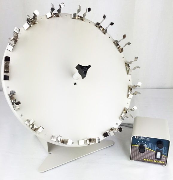 The Glas-Col Rugged Rotator is a compact, benchtop rotator designed to hold a variety of laboratory glassware. With a variable speed drive adjustable from 0 to 83 RPM, it allows gentle mixing or rapid agitation depending on your application. Its continuous-duty motor ensures reliable operation even during long, demanding schedules. The rotator includes a unique clamping device that positions the motor within a 110° arc while keeping containers visible during rotation, and a cord-attached speed control module allows safe and convenient operation.