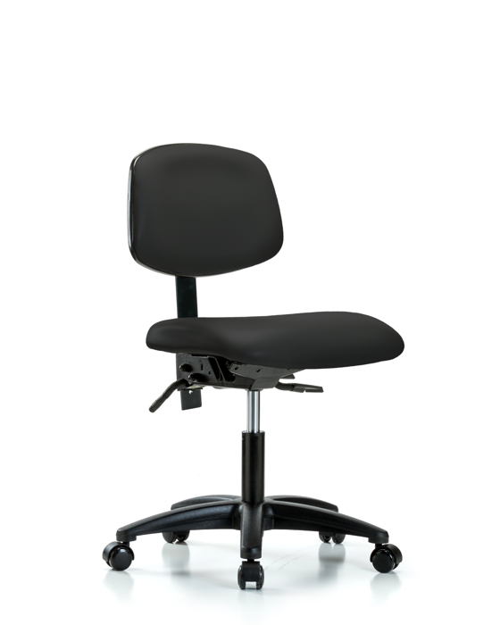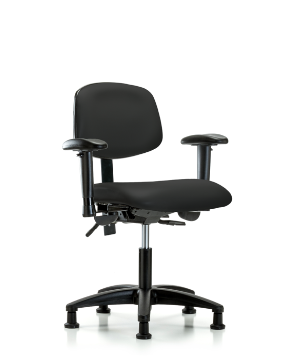 Black Vinyl Nylon Base Chairs, Desk Bench Height is adjustable from 18 - 23 inches from the top of the seat to the floor and features ergonomic adjustments including seat height and locking back tilt. Each chair is available with a nylon or chrome adjustable foot ring, locking seat tilt, 6-way adjustable arm rests. The black, nylon-reinforced fiberglass base with stationary, non-marring glides or casters are suitable for hard floors in chemical, soil, and puncture-resistant polyurethane.