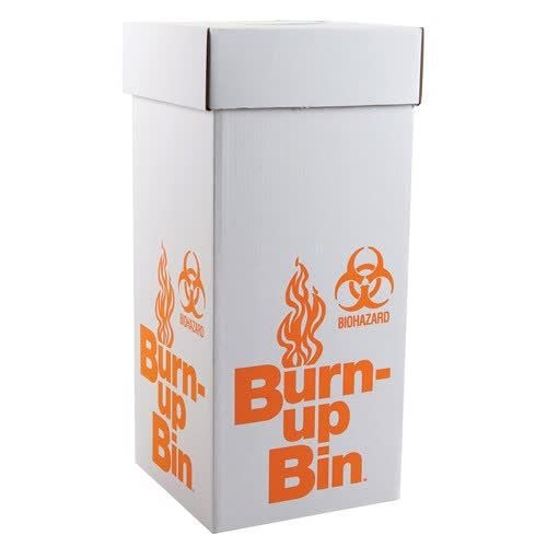 Burn-Up bin. Colorful graphics allow for quick for quick identification. Boxes fold for economical shipping and storage. Closure assures safe, hygienic disposal. Supplied with tough 2 millimeter polyethylene liner. 6 disposal boxes per case.
