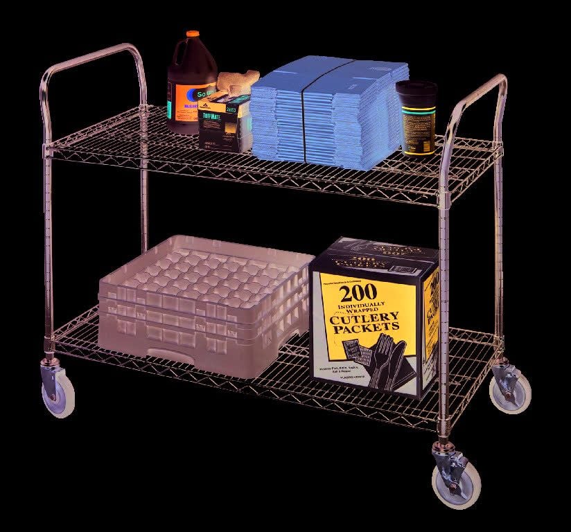 Ordering Information: Supplied with two or three shelves, two inverted "U" frame leg/handle assemblies, and four 12.7cm (5") swivel casters.