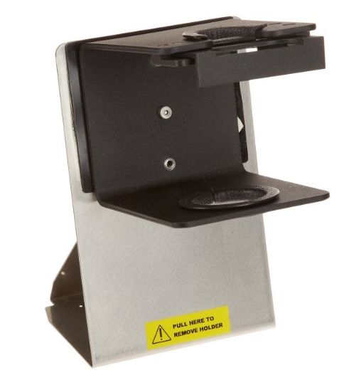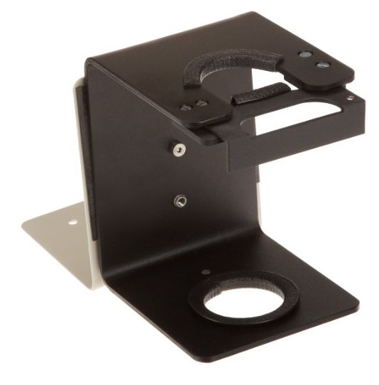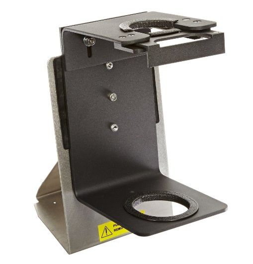 The separatory funnel holder is designed to allow 1- or 2-liter separatory funnels to be held in the positions necessary for sample processing, but with minimum handling of fragile funnels. From the upright, or fill, position the funnel may be rotated to the 45° or 60° position for shaking and then returned to the upright position for the addition of materials or extracting. The flask may remain in the holder during the entire cycle. This holder requires the use of the Universal Mounting Platform (099A BT6000).