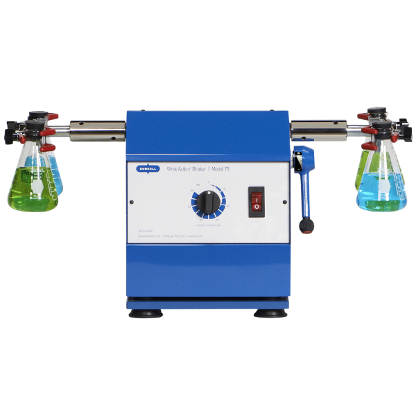 Our standard unit, the Burrell Scientific Model 75 Wrist Action® Shaker, is designed to operate at 385 oscillations per minute ± 10%. The action of this shaker simulates the back and forth action of the human wrist. The adjusting lever can achieve an action from a gentle swirl to an aggressive agitation simply by increasing the angle of movement from 1 degree to 15 degrees. Though the actual oscillation speed does not vary, the distance through which the vessels move with each oscillation increases with the change in the lever arm setting from 1-15. A built-in timer can be set for continuous shaking (°) or from 0 minutes to 60 minutes.