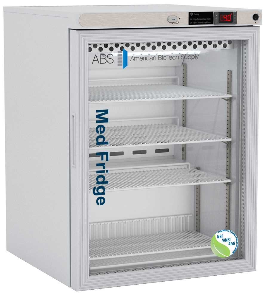 These NSF Certified Freestanding Undercounter Glass Door Vaccine Refrigerators utilize microprocessor controllers and feature temperature alarms, remote alarm contacts, LED interior lighting, and probe access ports with included probes. American Biotech Supply Vaccine Storage Refrigerators utilize HFC-free refrigerant for environmental health and energy efficiency.