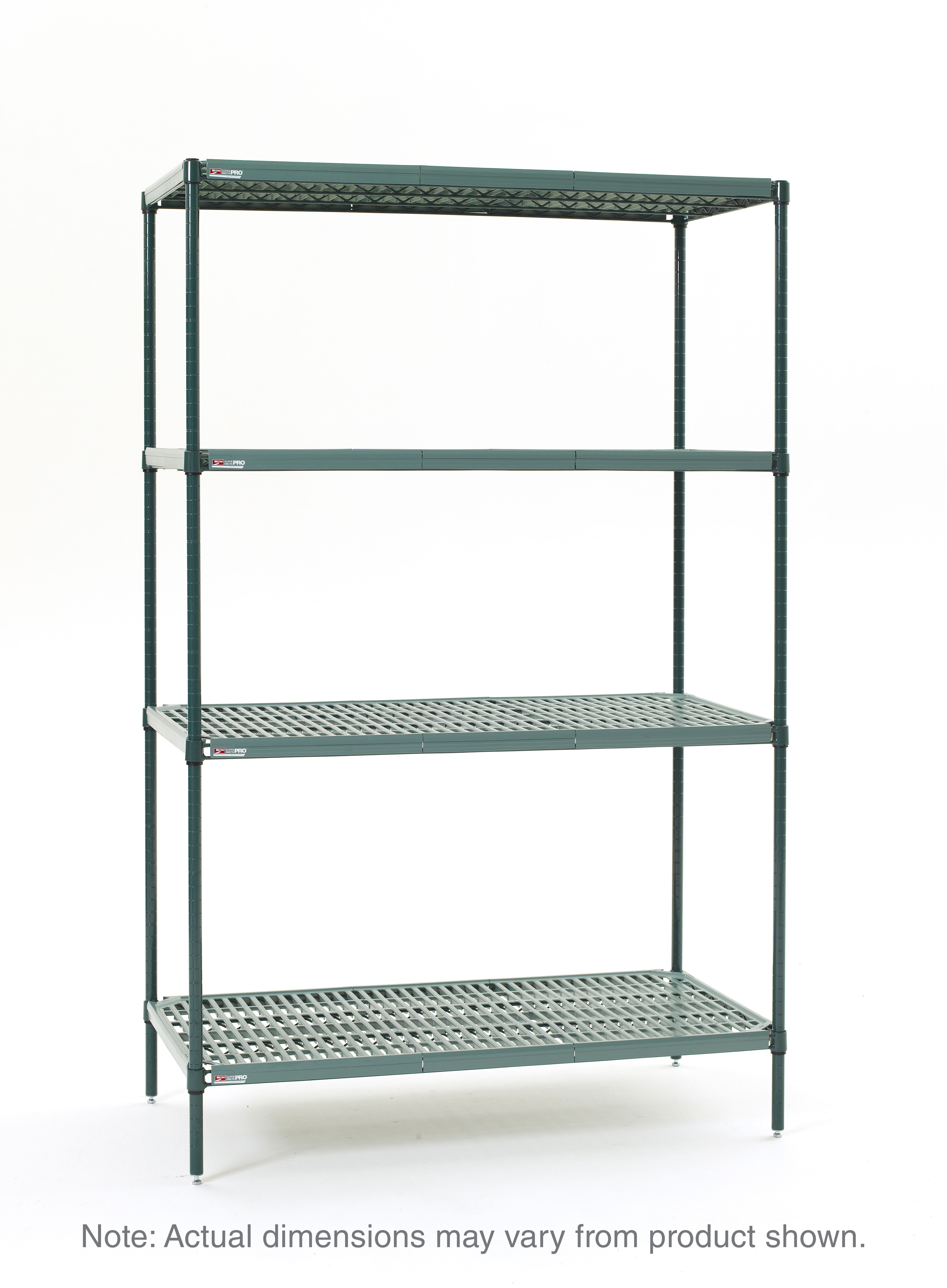 The Super Erecta Pro 4-Tier Convenience Pak is a complete shelving unit in a single box. This shelving unit is corrosion resistant and constructed of removable polymer open grid shelf mats over a wire shelf frame.